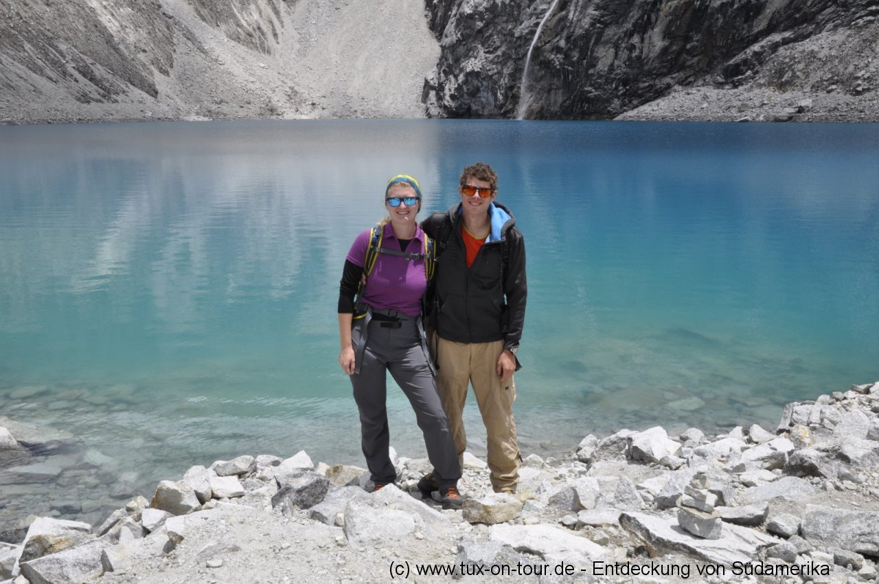 Oben an der Lagune gibt es dann erst mal eine Brotzeit, wie es so üblich ist als Bayer auf Bergtour. In unserem Fall gibt es selbst gebackenes Brot und diesmal haben wir auch mal einen guten Käse gefunden und den gibt es dazu mit Eiern. Als wir beim Beenden unserer Brotzeit sind, kommt ein Pärchen und fragt uns in guten Englisch, ob wir noch Wasser für sie übrig haben, denn sie haben zu wenig dabei – 1 Liter für zwei Personen ist schon etwas wenig. Natürlich haben wir genug und geben etwas ab und kommen so ins Gespräch. Es stellt sich heraus, dass die Zwei aus Israel/Ärzte sind und selbst 3 Monate reisen. Er ist schon vor 10 Jahren in Südamerika unterwegs gewesen sowie Europa ist ihm nicht fremd und so Sonnen wir uns und verquatschen uns ein paar Stunden bis wir dann zusammen den Abstieg antreten.